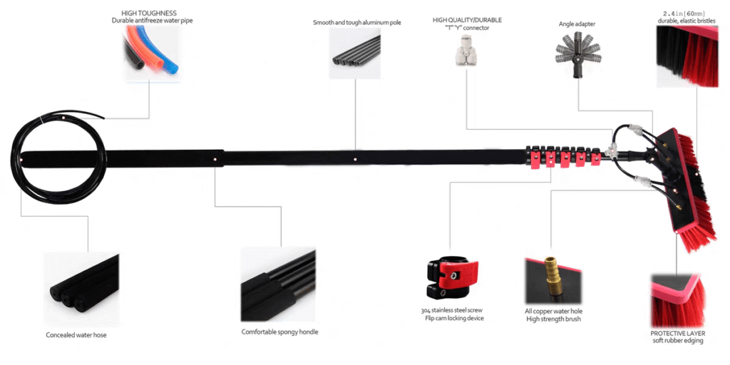 Anbüles Solarmodul-Waschmaschine ist für die Reinigung mit reinem Wasser konzipiert: Ein doppelter Bürstenkopf löst den Schmutz ohne zu kratzen und eine Hochdruckpumpe sorgt für einen gleichmäßigen, effektiven Durchfluss. Das Ergebnis ist eine schnelle, gründliche Reinigung ohne scharfe Chemikalien.